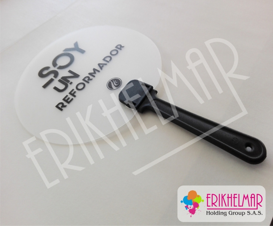 Abanicos en polipropileno con formas diferentes, (corazón, luna, estrella, circulo, trebol) marcados en screen y mango stick para facilitar su uso.