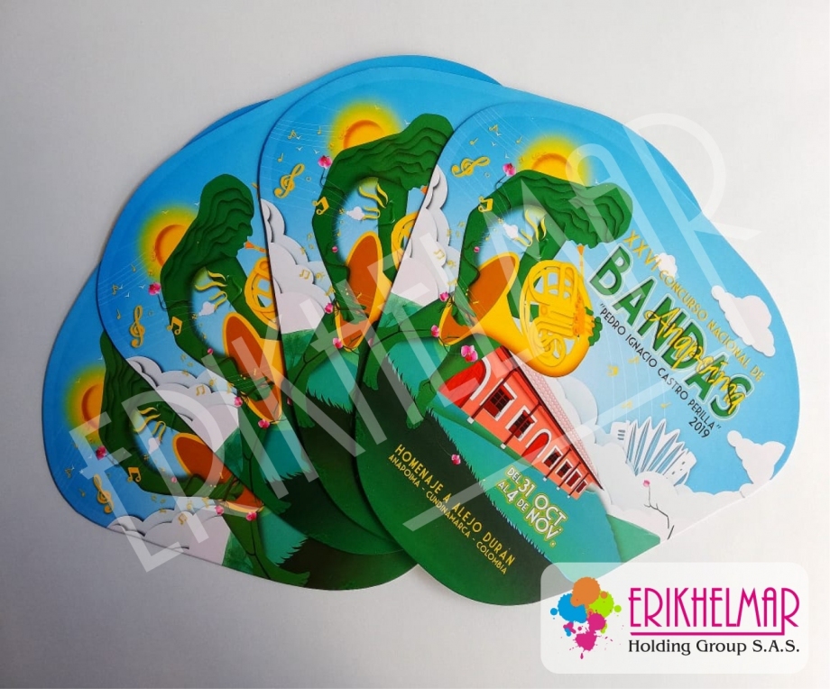Abanicos de cartón impresos full color y plastificados por ambas caras, estos abanicos son ideales para eventos masivos, con ellos podrá transmitir la información de su evento, información de su establecimiento, impulsar un producto o tener un presente de su marca para sus clientes.